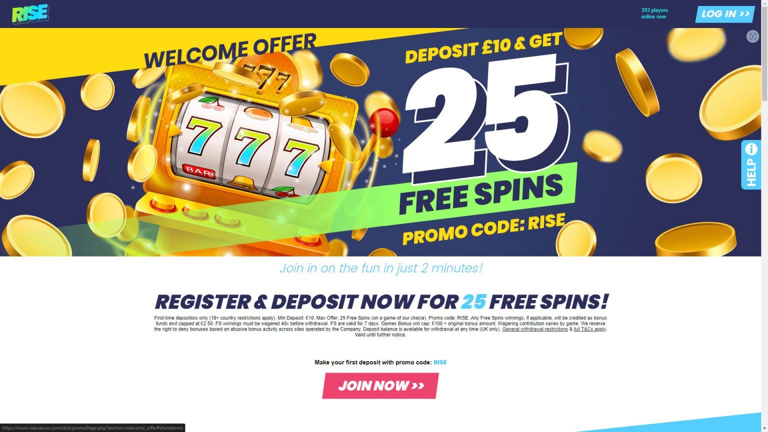 After registering and becoming a new player at Rise Casino UK, you will be entitled to a welcome bonus of up to 25 Bonus Spins. To claim the welcome bonus, you must enter the promotion code RISE.